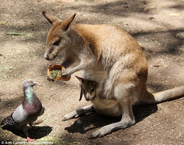 وتضيف الصحيفة: إن الكنغر وصغيرها كانا يأكلان من الطعام حين شاهدا حمامة تتطلع إليهما وإلى الطعام، وهنا تقدّمت الكنغر الأم ومدّت يدها بالعلبة إلى الحمامة وكأنها تقول 'تعالي شاركيني الطعام'.